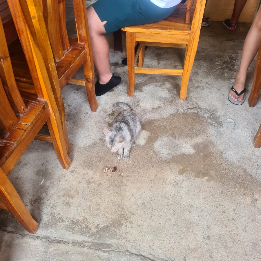 라차섬 안 식당에 있던 고양이와,, 투어에 포함 된 식사,,, 모르겠어요. 회사 점심 같아요 ,, 회사 점심 피해서 왔는데,, 이건 뭐,, 풍경 좋은 회사 점심이에요
